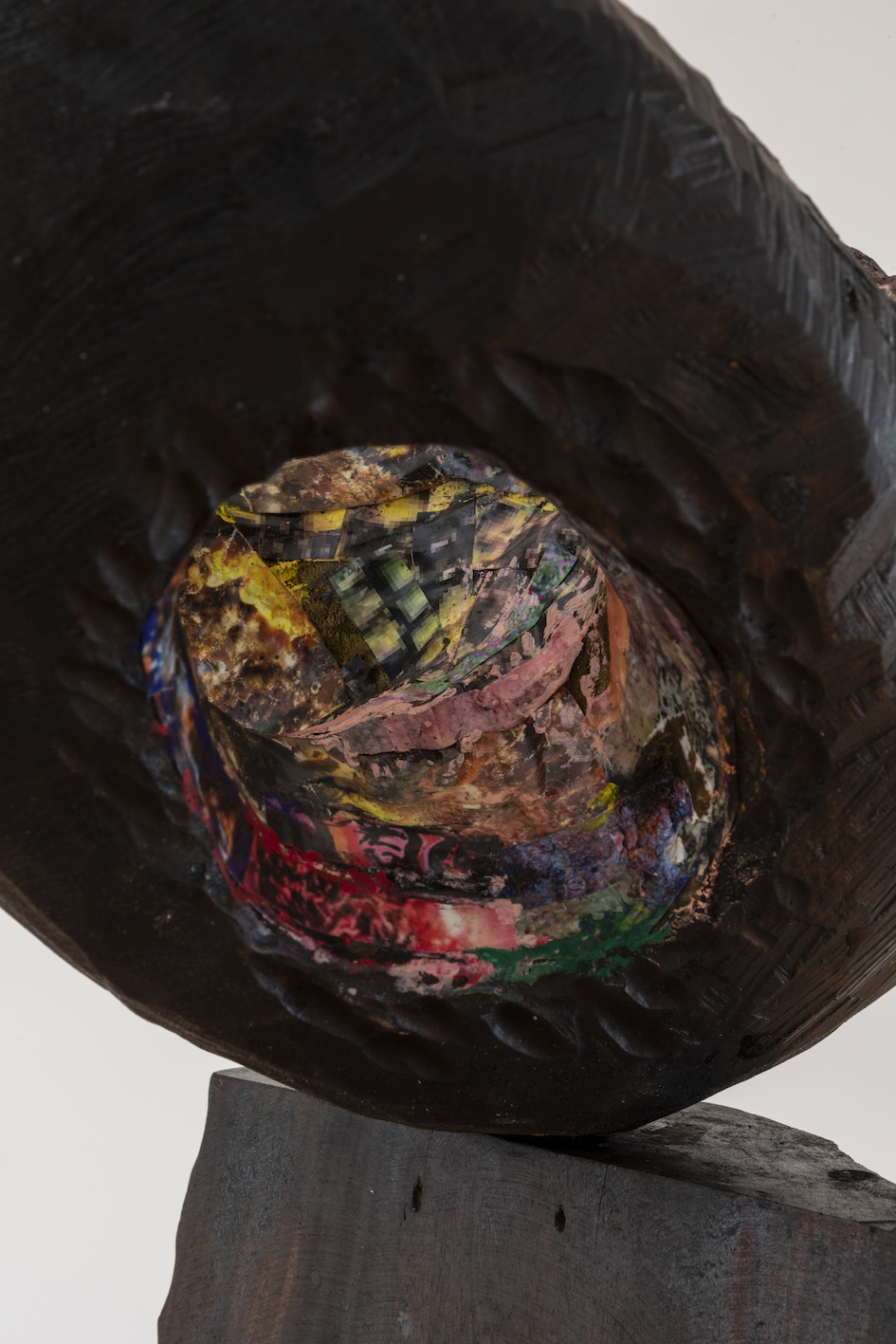Anderson Borba, Cave Head, 2026 (detail), Wood, paper, stone, bronze, oil pastel, shoe polish, wood stain, lacquer, 20 x 160 x 19 cm. Courtesy of the artist and The approach, London. Photo: Mike Bolam