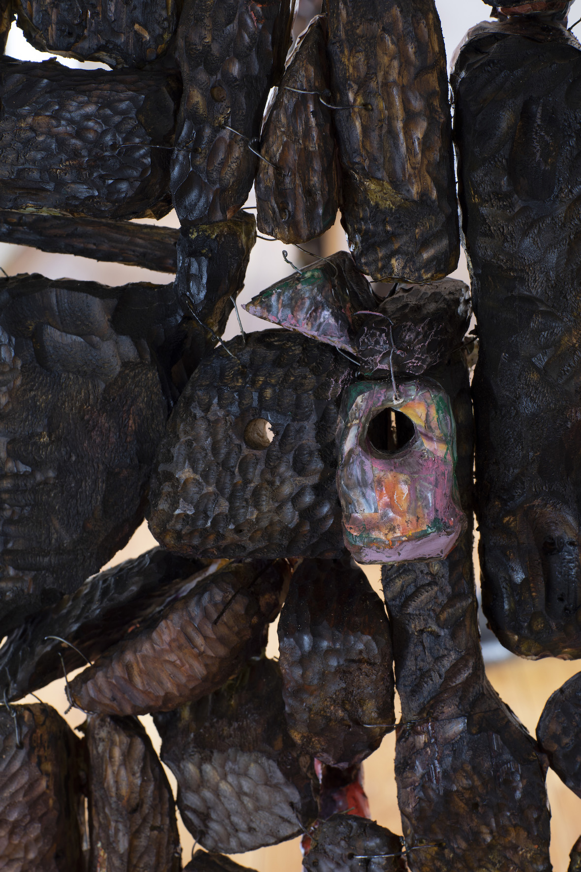 Anderson Borba, Cloak, 2026, (detail), wood, paper, unfired clay, stones, wire, wood stain, oil pastel, lacquer, 204 x 34 x 7 cm. Courtesy of the artist and The approach, London. Photo: Mike Bolam